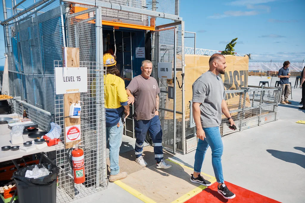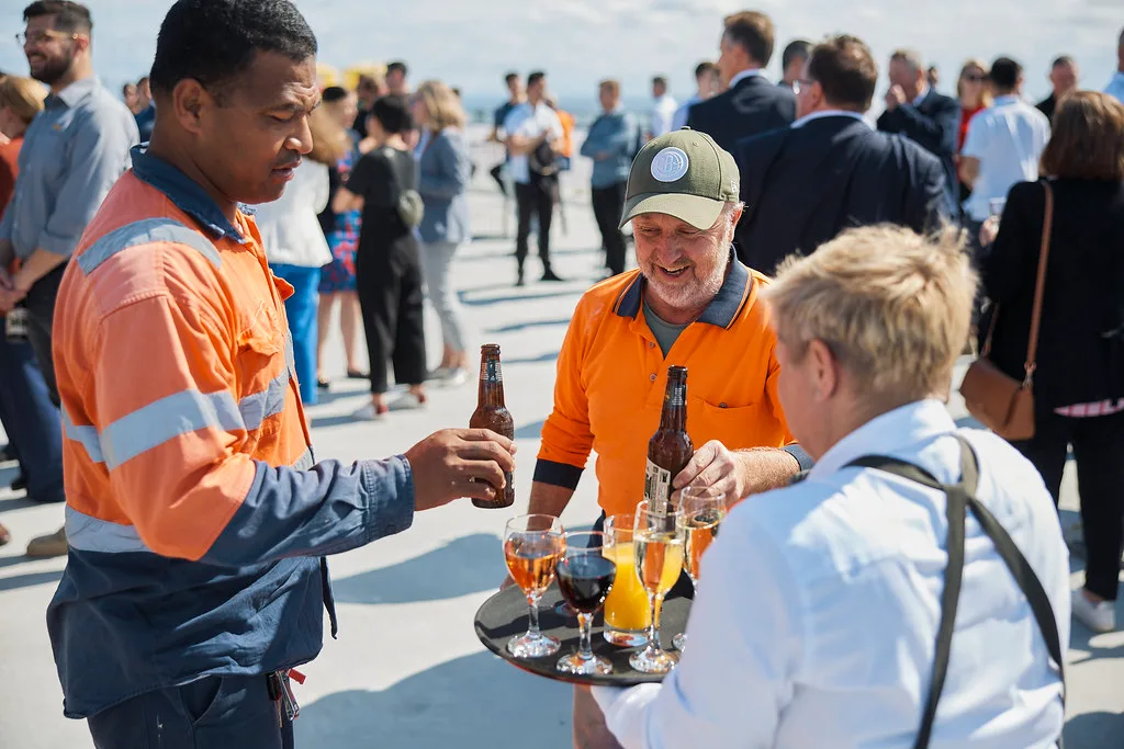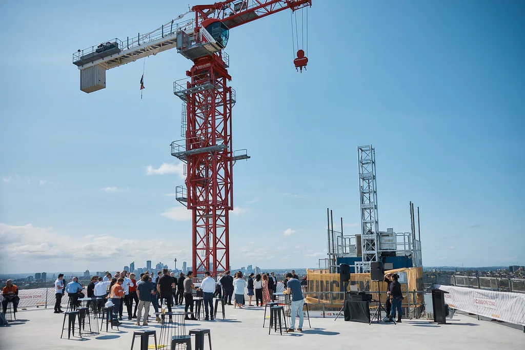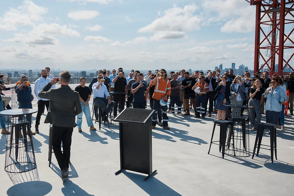 Our team designed the guest experience to contrast the raw construction environment with a polished event feel. This was achieved through a carefully curated combination of catering and beverage services, a bespoke red carpet entry to elevate the arrival moment, and stylish furniture hire to create a functional yet sophisticated event space. Entertainment was provided by a professional DJ, setting an upbeat and celebratory atmosphere while complementing the rooftop setting.