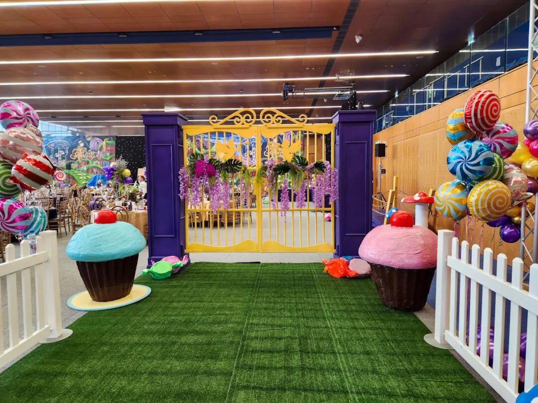 We commissioned custom props and oversized installations from specialty suppliers, including giant lollipops, colourful candy features, and a bespoke entrance archway that served as the “gateway” into the chocolate factory. Every detail was designed to evoke wonder and delight, from floral centrepieces with hidden golden tickets to theatrical lighting that bathed the room in whimsical colour.